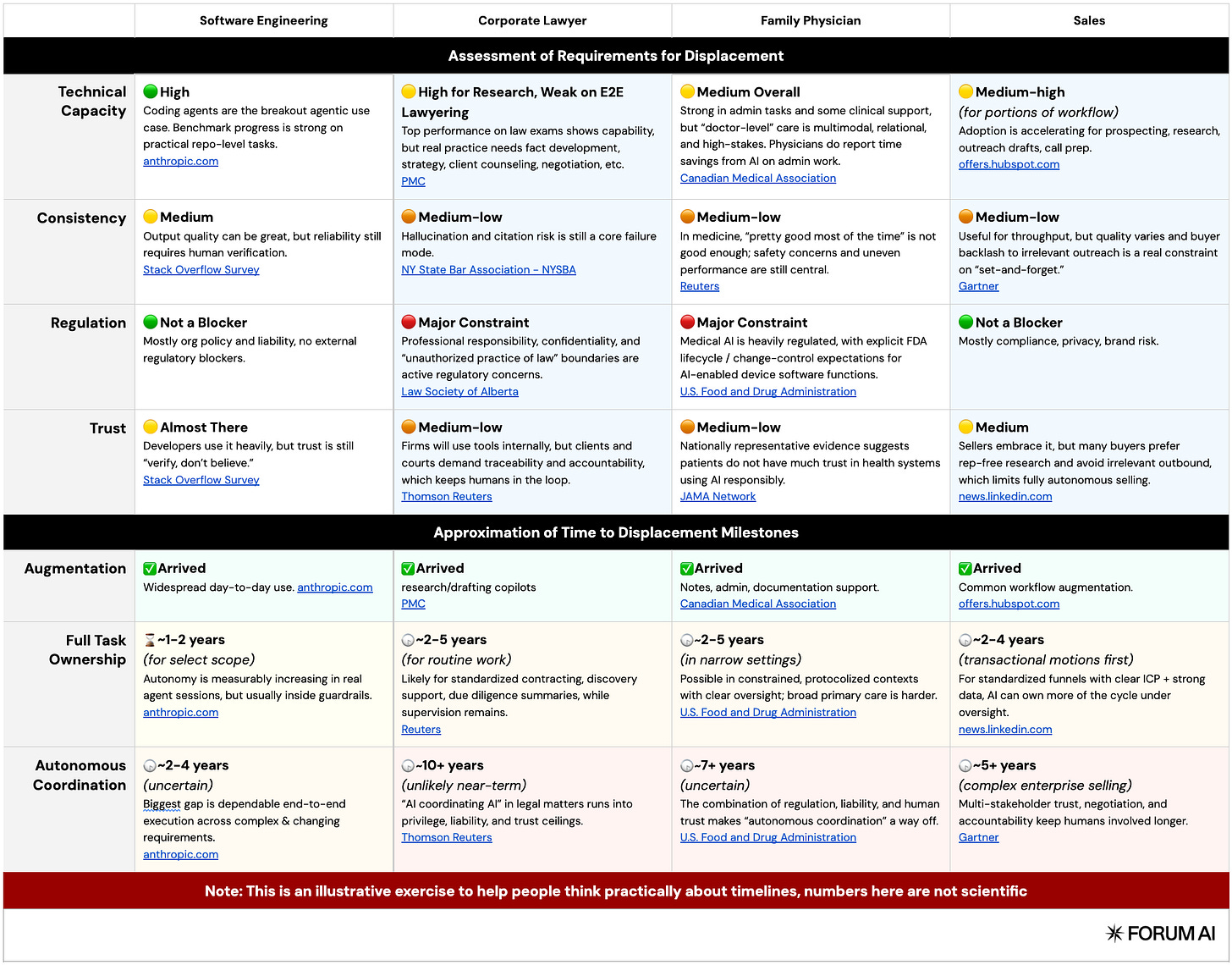 No one can predict the future. But we can reason from what we are actually seeing in production AI systems today. Instead of arguing over whether all white collar jobs vanish by 2028, we can get specific about what the path would look like, and how close we really are to those thresholds across various industries.